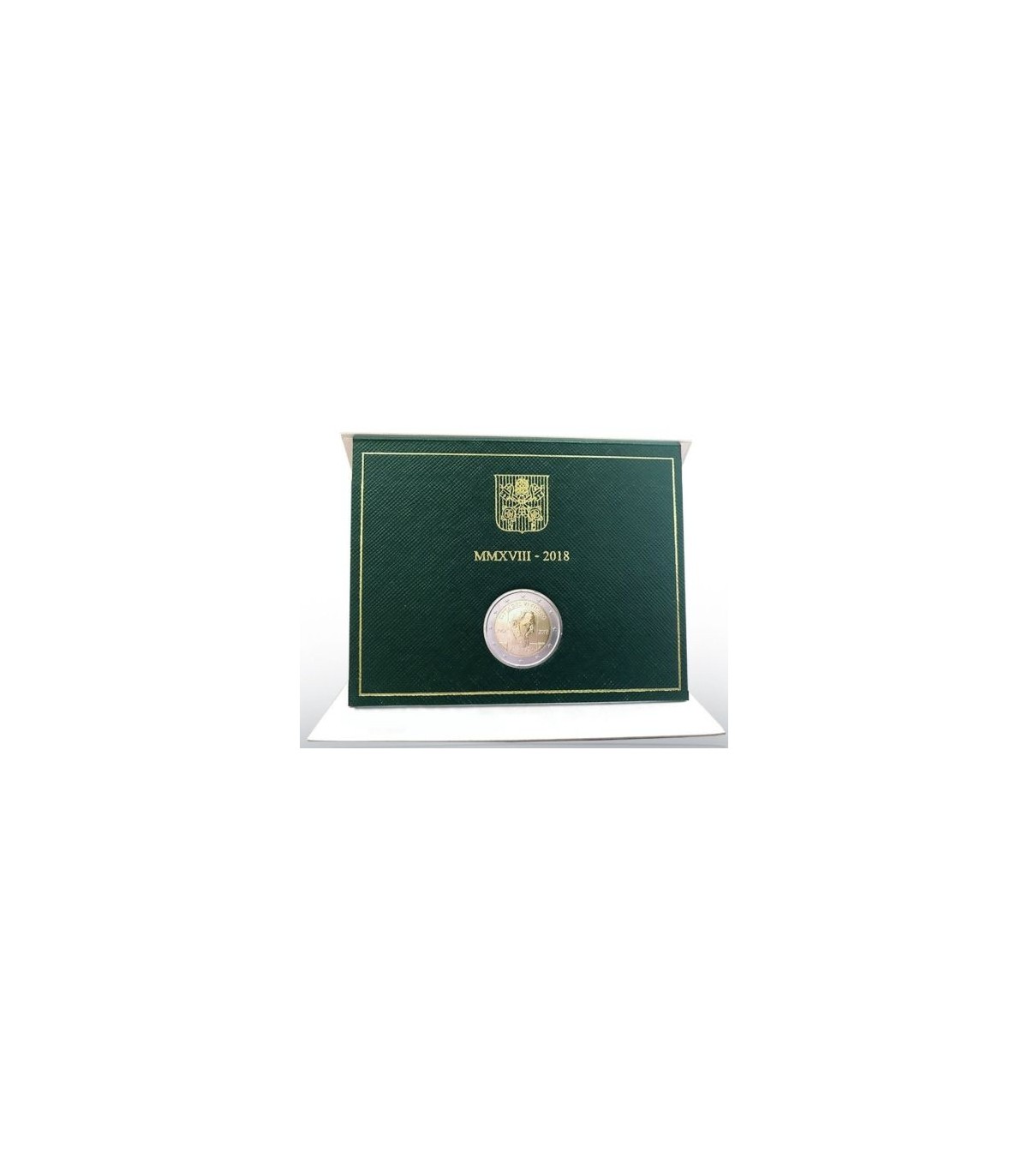 Segunda moeda de 2 euros emitida pelo Vaticano para 2018, dedicada ao 50.º aniversário da morte do Padre Pio, eclesiástico italiano, canonizado em 2002, que se diz ter sido o único sacerdote a apresentar os estigmas, as feridas do Cristo crucificado na tradição católica.