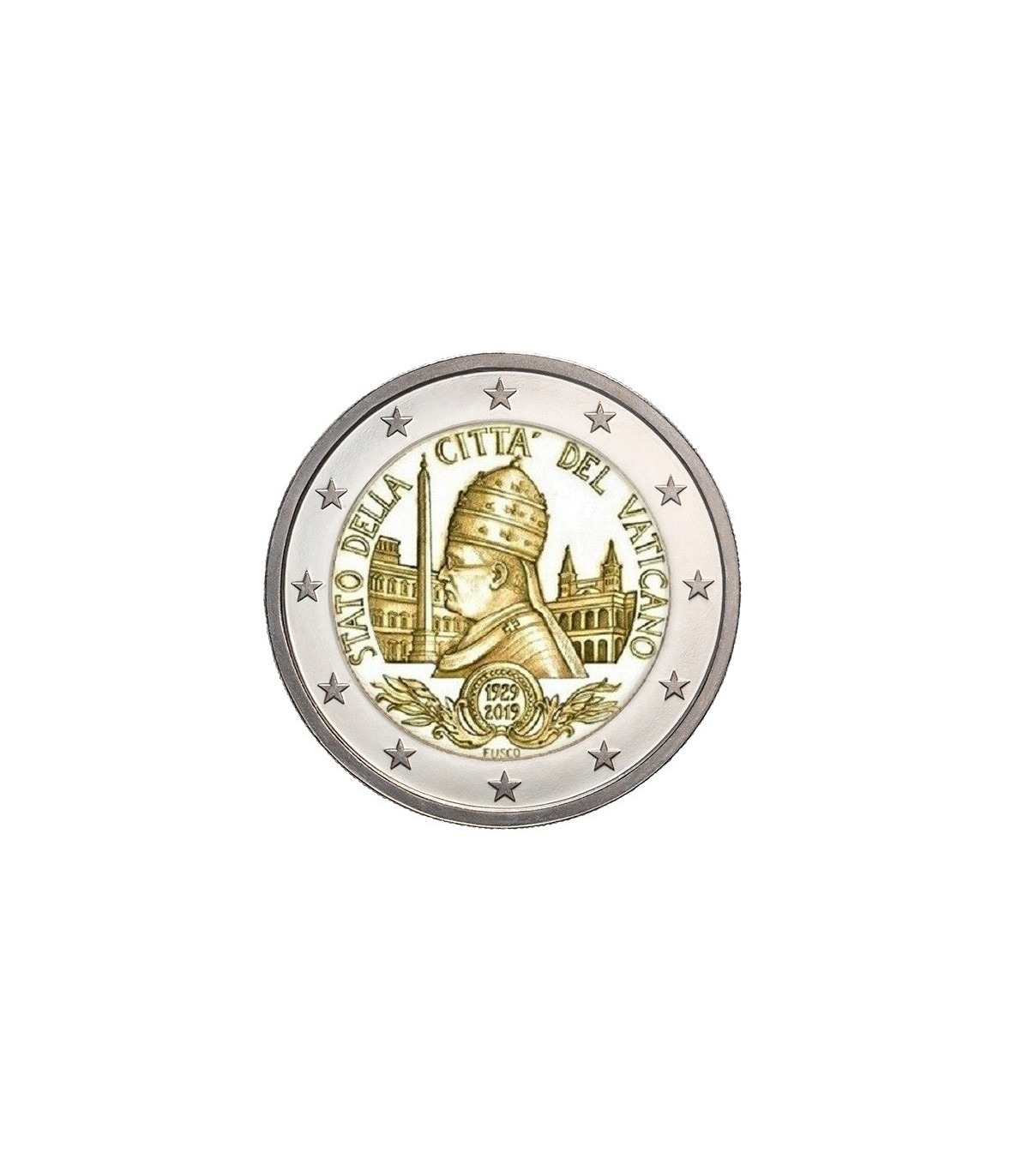 Segunda moeda de 2 euros emitida pelo Vaticano para 2019, dedicada ao 90.º aniversário da fundação do Estado do Vaticano.